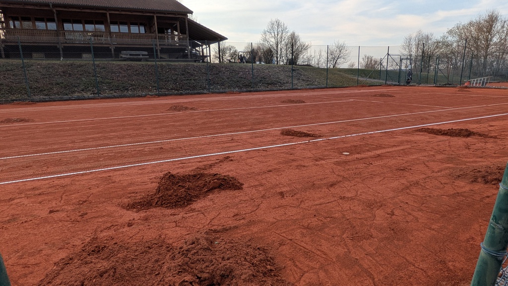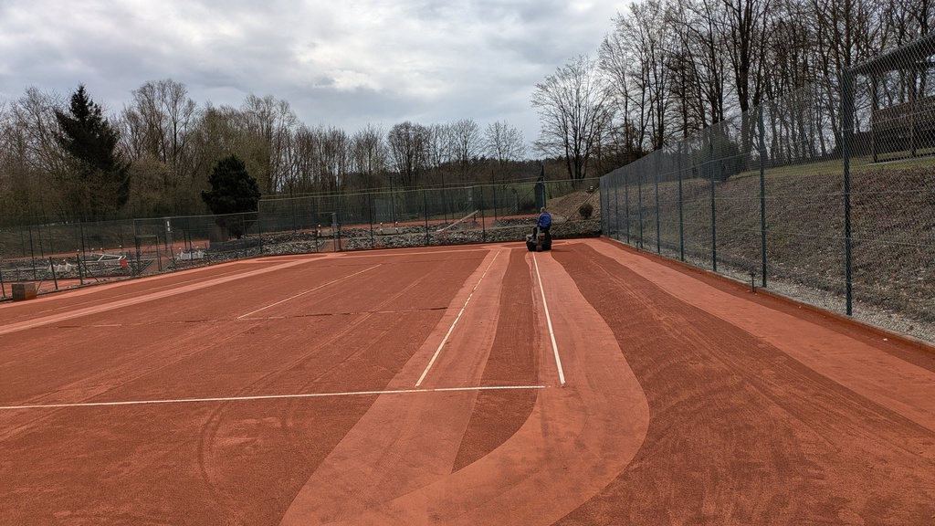 In unseren Breiten leiden solche Plätze im Winter unter Frosteinwirkung: Die Oberfläche weicht auf und die Linien werden instabil. Deshalb müssen solche Plätze im Frühjahr wieder instandgesetzt werden. Die oberste Sandschicht wird zusammen mit Verunreinigungen wie Moos, Baumsamen und Laub entfernt und durch frisches Zeigelmehl ersetzt. Das lassen wir seit Jahren von der Firma Clemenza Tennisplatzbau erledigen. Das kostet den Verein eine Stange Geld, aber die Qualität unserer Plätze ist uns das wert.
