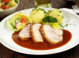 Als Abendessen gibt es Schweinebraten und als vegetarische Alternative Gemüselasagne.